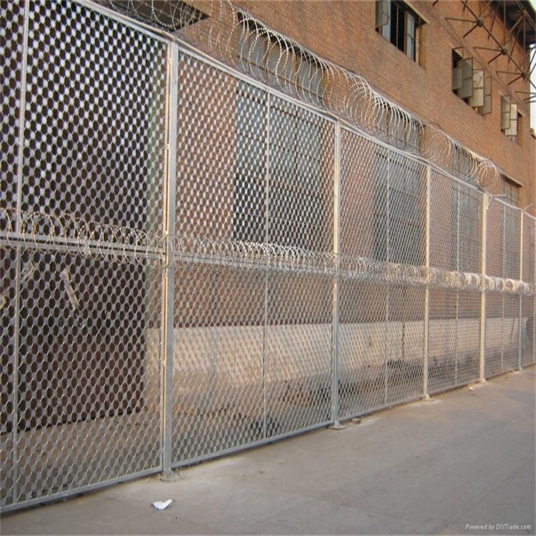 監(jiān)獄安防網(wǎng)又稱監(jiān)獄護欄網(wǎng)或監(jiān)獄隔離柵, 它主要是采用高強度的刀片剌網(wǎng)與普通防護網(wǎng)的結(jié)合,由V型支架立拄,加強型焊接片網(wǎng),安全防盜連接件和刀片刺網(wǎng)組成。刀片剌網(wǎng)是一種新型防護網(wǎng),由銳利尖角鍍鋅鋼板或不銹鋼薄板做刀片,鋼絲做芯線組合而成的防護器材。