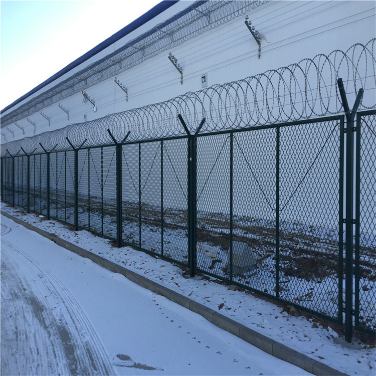 監(jiān)獄鋼網(wǎng)墻是一種新型防護(hù)網(wǎng),這種新型刀刺護(hù)欄網(wǎng)由蛇腹式刀刺網(wǎng)和焊接刀片刺網(wǎng)網(wǎng)片或有鋼絲焊接的網(wǎng)片組成。監(jiān)獄隔離網(wǎng)可平地安裝,也可在圍墻上二次安裝,有效防止攀逃。直刺式刺網(wǎng)隔離帶,是用柱體和普通刺繩橫、縱、斜向交叉綁定成刺網(wǎng)隔離帶。主要用于特殊地帶、軍事基地圈護(hù)、溝壕圈護(hù),安裝簡易,經(jīng)濟(jì)耐用。 監(jiān)獄護(hù)欄網(wǎng)又稱作“Y型安全防御護(hù)網(wǎng)”,是由V型支架立柱,加強(qiáng)型焊接片網(wǎng),安全防盜連接件和熱鍍鋅刀片刺籠組成,強(qiáng)度和安全防御性級(jí)別很高。近年來,被廣泛應(yīng)用在監(jiān)獄,軍事基地等高安全場所。注:如果在監(jiān)獄護(hù)欄網(wǎng)頂部加裝刀片刺絲、刀片刺繩后又很好的增強(qiáng)了安全防護(hù)性能。采用電鍍、熱鍍、噴塑、浸塑等防腐形式,具有很好的抗老化、抗曬、耐候等特點(diǎn)。其產(chǎn)品造型美觀、花色多樣,既起到圍欄作用,又起到美化作用。由于具有安全性高、防攀爬能力好,網(wǎng)片連接方式采用特制SBS緊扣件,有效防止人為的破壞性拆卸,橫向四道折彎加強(qiáng)筋,使網(wǎng)面強(qiáng)度顯著增加。